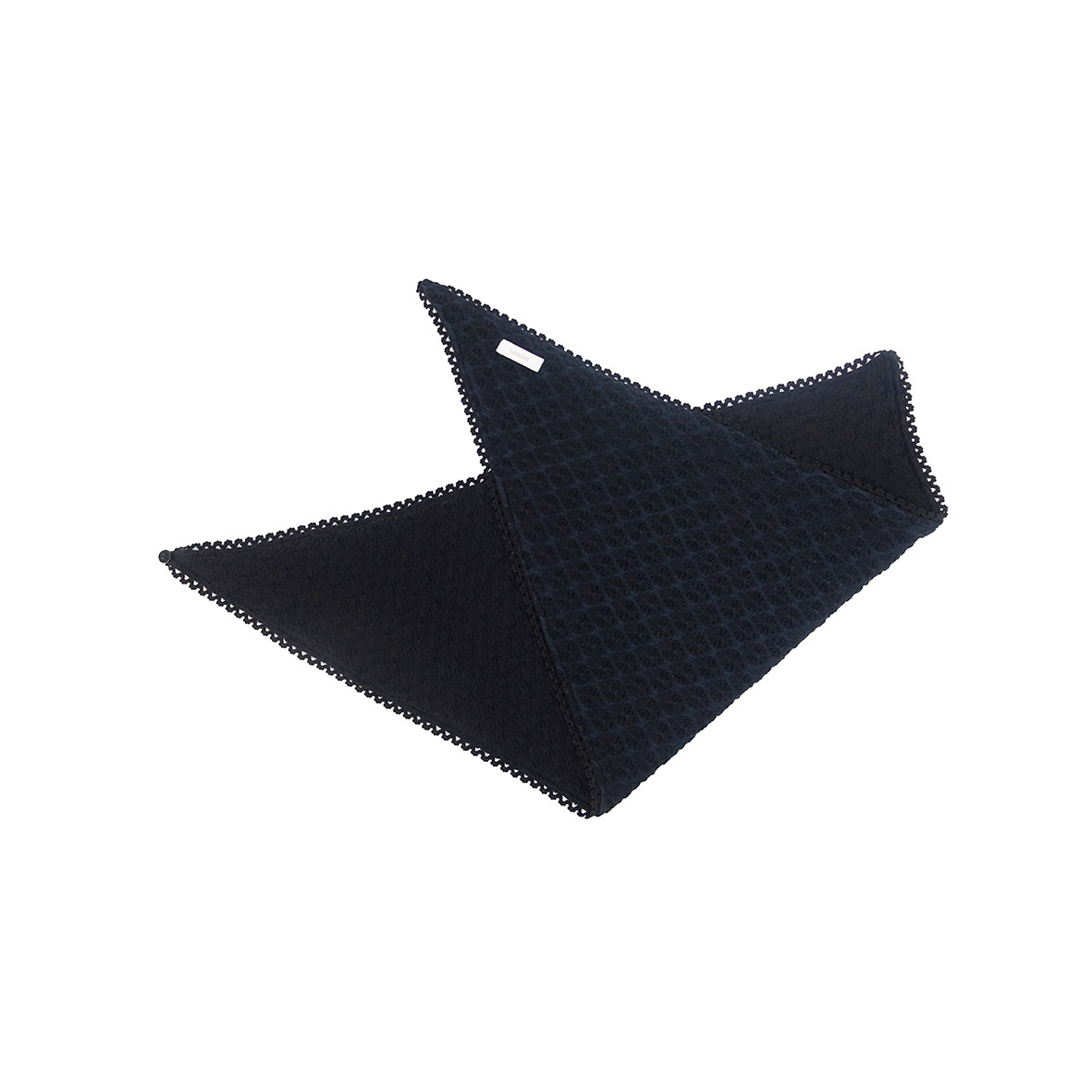 Trójkątna chusta żakardowa z koronkowym wykończeniem. Uszyta z dwóch różnych odcieni tego samego wzoru – z jednej strony chusty czerń wpada w granat, z drugiej w brąz.